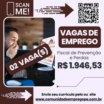 Fiscal de Prevenção e Perdas, 02 vagas com salário de R$ 1946,53 para segmento de comércio varejista
