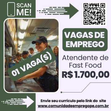 Atendente de Fast Food com salário de R$ 1700,00 para empresa do segmento de alimentação