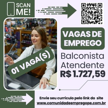 Estamos em busca de balconista dedicado e proativo para integrar nossa equipe. Imprescindível ter facilidade em lidar com o público, visando o conforto, qualidade, praticidade, segurança e cordialidade nos serviços prestados aos seus clientes.