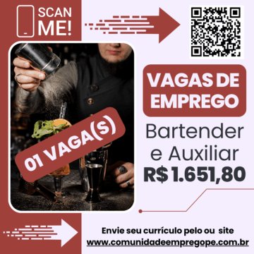 Bartender/ Auxiliar de Bartender com salário de R$ 1651,80 para segmento de alimentos e bebidas